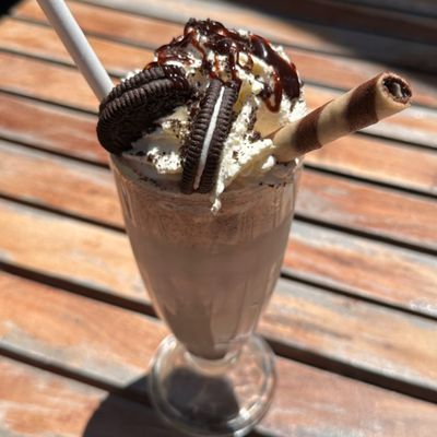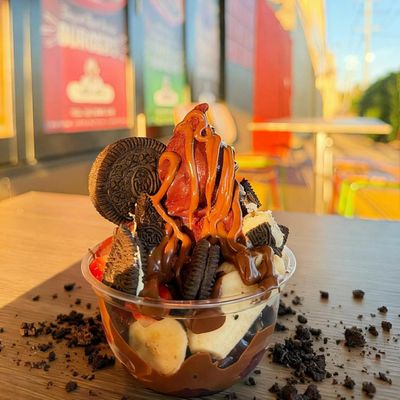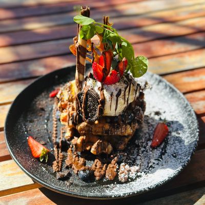 2 pcs. waffle, Oreo cookies, nutella, vanilla ice cream, fresh berries, banana and maple syrup