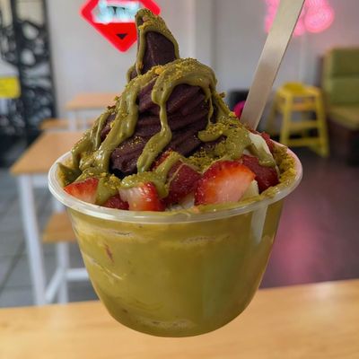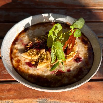 macadamia milk-soaked oats, banana, mixed berry compote, toasted pistachio crumble, coconut sugar