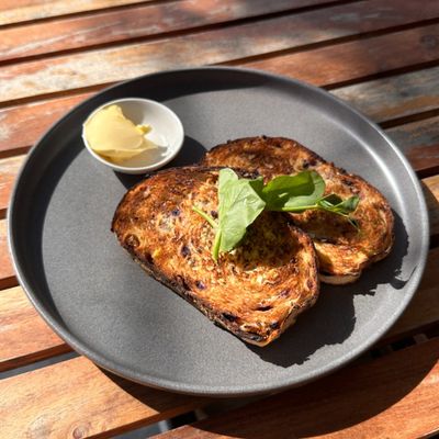 2pcs. toasted Three Mills orange and raisin sourdough with butter