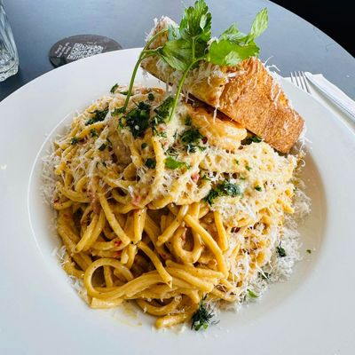 prawns, bacon, chilli cream sauce, pecorino, chilli flakes, chives with garlic butter focaccia