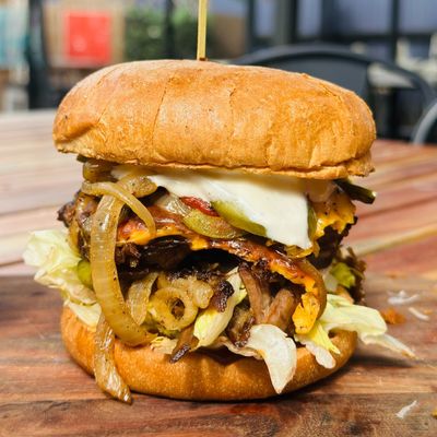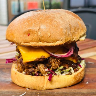 slow braised beef brisket, coral lettuce, pickled cucumber, caramelised onion and capsicum, smokey aioli, mustard bbq, jack cheese