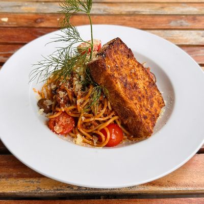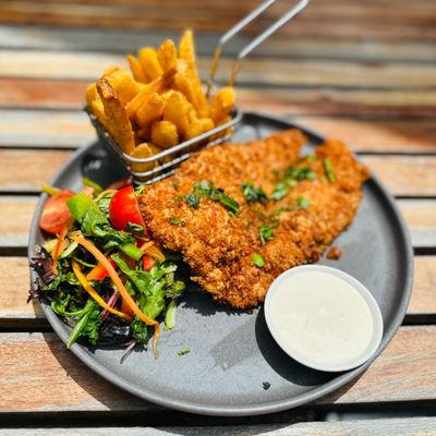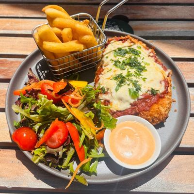 chicken schnitzel topped with bolognese, mozzarella, parmesan, minced herbs, served with chips, smoky aioli and your choice of salad