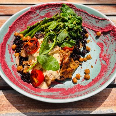 grilled marinated chicken, black rice, garlic sauteed greens, charred heirloom tomato, capsicum and onion, beetroot hummus, cajun yogurt, chickpea, fresh herbs