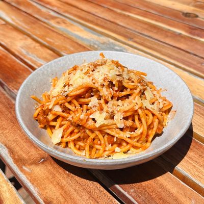 spaghetti, bolognese sauce, parmesan cheese