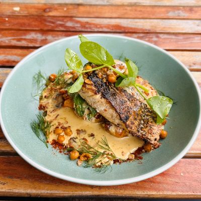 grilled barramundi, Tuscan cream sauce, fried chat potatoes, Moroccan chickpeas, fried shallots, fresh herbs, mushroom, spinach