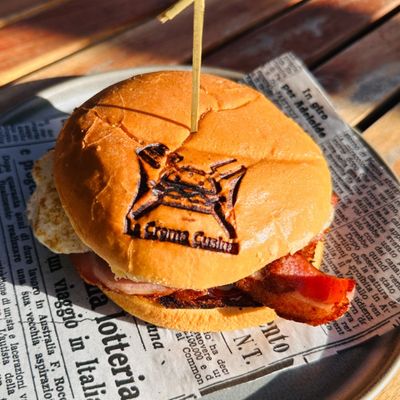 bacon and fried egg in a toasted bun with your choice of sauce