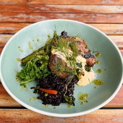 grilled marinated lamb chops, black rice, garlic sauteed greens, charred capsicum and onion, cajun yogurt, mojo verde, fresh herbs