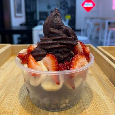 with fresh berries, banana, vanilla ice cream, nutella, maple syrup