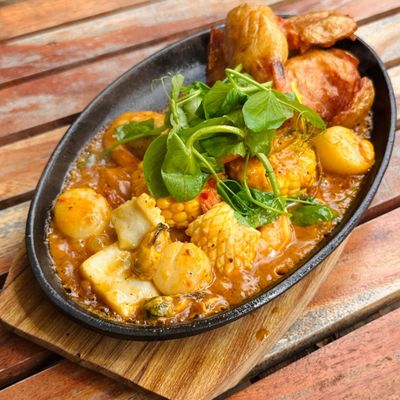 crab, prawn, mussel, calamari, scallop boil served with fried chat potato