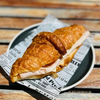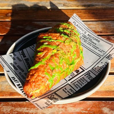 scrambled eggs, feta cheese, dukkah, peri-peri sauce and spring onion on a toasted croissant